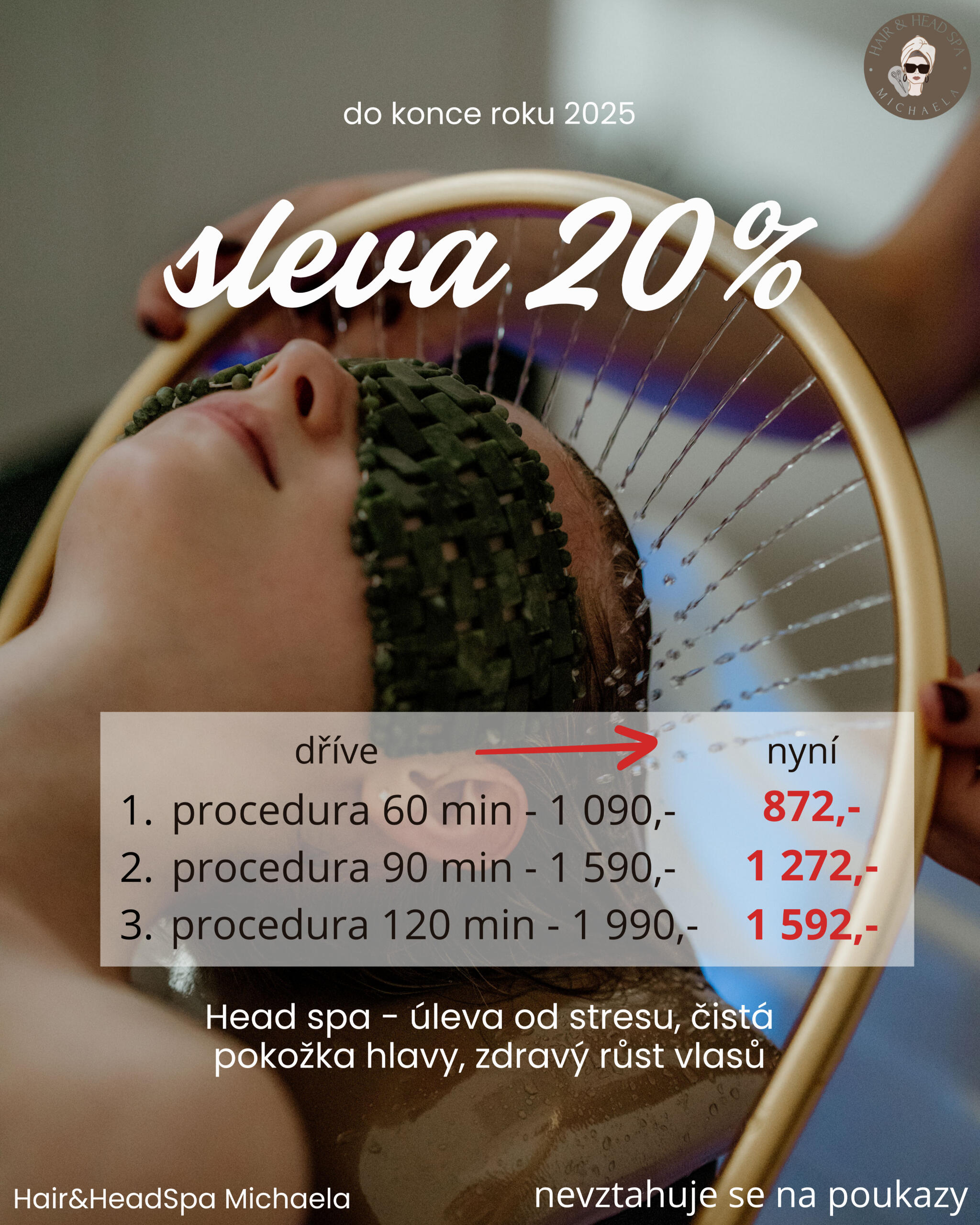 Head spa je relaxační procedura zaměřená na masáž hlavy, pokožky a vlasů. Pomáhá uvolnit napětí, zlepšit prokrvení pokožky hlavy a podporuje zdravý růst vlasů. Často zahrnuje masáže, esenciální oleje a speciální přípravky pro vlasy. Cílem je zmírnit stres a zlepšit vzhled vlasů.